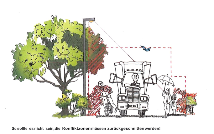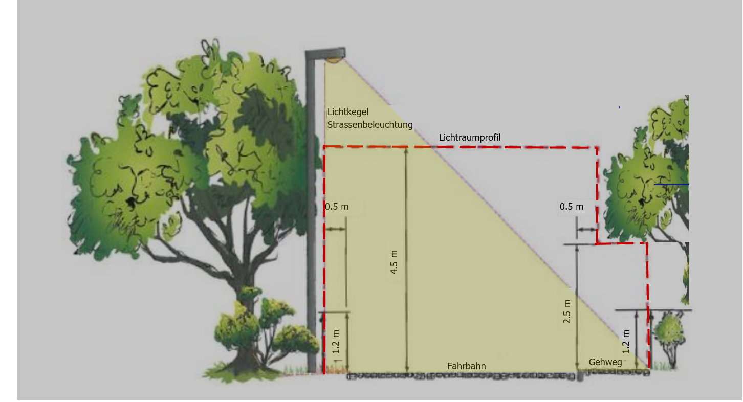 Gemäss § 38 des Strassenverkehrsgesetzes dürfen Strassen und ihre Benützerinnen und Benützer nicht durch Bauten, Anlagen oder Bepflanzungen beeinträchtigt werden. Über Gehwegen ist ein freier Raum auf mindestens 2.5 Metern Höhe einzuhalten, über Strassen eine Durchfahrtshöhe von 4.5 Metern. Seitlich ist ein Abstand von 0.5 Metern zur Bepflanzung erforderlich. Hecken entlang öffentlicher Strassen dürfen maximal 1.2 Meter hoch sein, im Bereich von Sichtbermen höchstens 0.6 Meter. Auch Pflanzen, die in den Lichtkegel von Strassenlampen oder die Sicht auf Verkehrssignale und Schilder beeinträchtigen, sind zu entfernen.